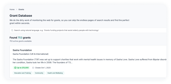 Access a regularly updated database of live grant opportunities tailored for charities and non-profits. With powerful filters and search tools, you can quickly surface the most relevant funding options for your projects.