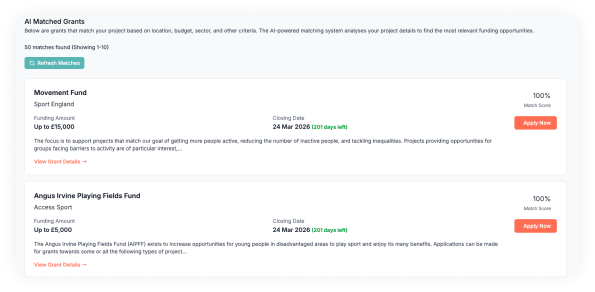 Upload a project, add details like location, budget, and theme, and Fundin automatically finds and prioritises the best-matching grants. Say goodbye to hours of manual searching, your shortlist is ready in seconds.