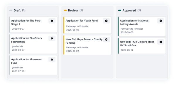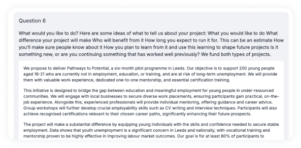 Turn your project details into strong application drafts with our AI-powered bid writing tool. It shapes your responses to funder requirements, giving you a solid first draft you can refine and submit with confidence.